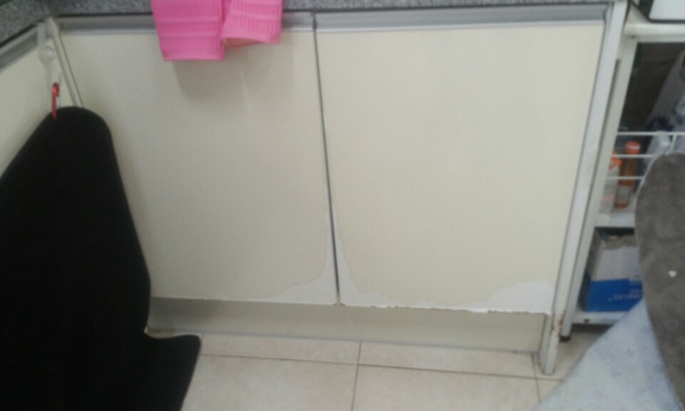 ▲남는 시트지로는 홀에 지내는 숫컷들 때문에 만신창이가 된 싱크대 벽으로 마무리.