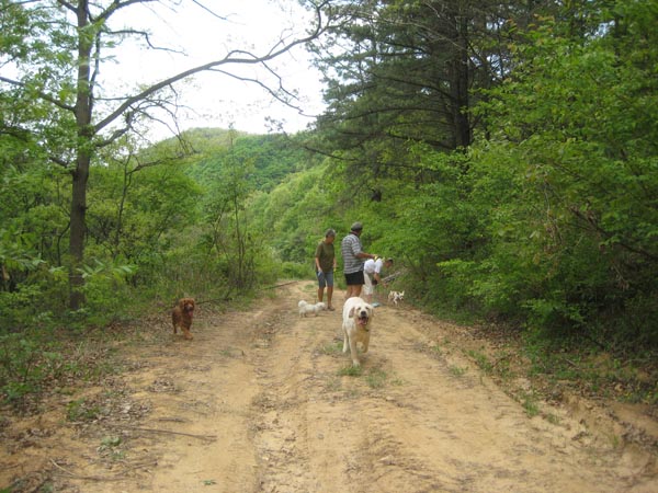 산책하고 있는 개들은 주로 미셀이 보은 읍에서 구조하였다. 좋은 집에 입양 간 흰색 리트리버는 주인이 여행을 가게되어 잠시 보은 보호소에 머물게 되었다. 미셀과 개들이 아름다운 초록색 숲 속을 지나....