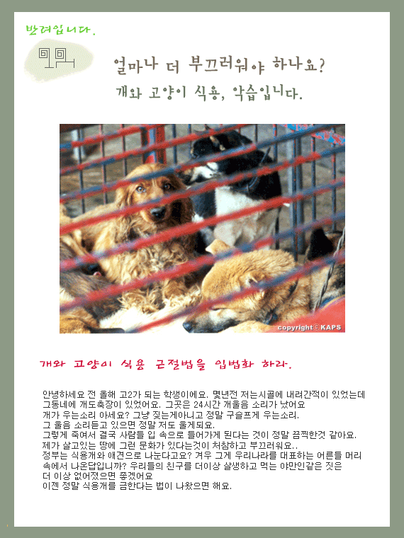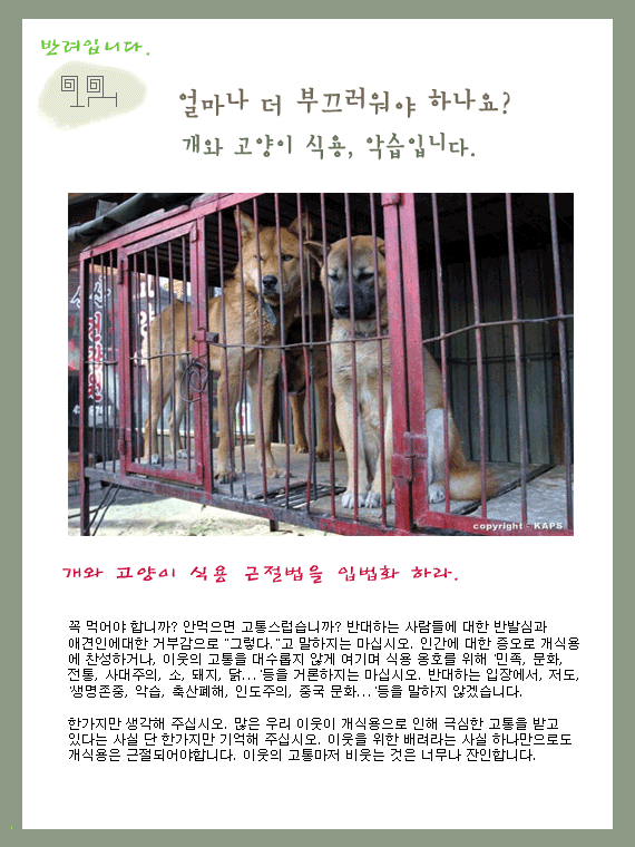 외면하지 마세요. 지금 필요한 것은 action입니다. 자신이 가진 작은 재능이라도 활용한다면 그보다 좋은 것은 없습니다. 개식용 근절이 아닌 개와 고양이 식용 근절. 분별된 것보다 힘을 모아서 나가는 것. 개와 고양이 식용 근절이 아직도 활개를 치는 이유는 이런 저런 핑계를 대는 정부보다는 우리 잘못이 더 큽니다.