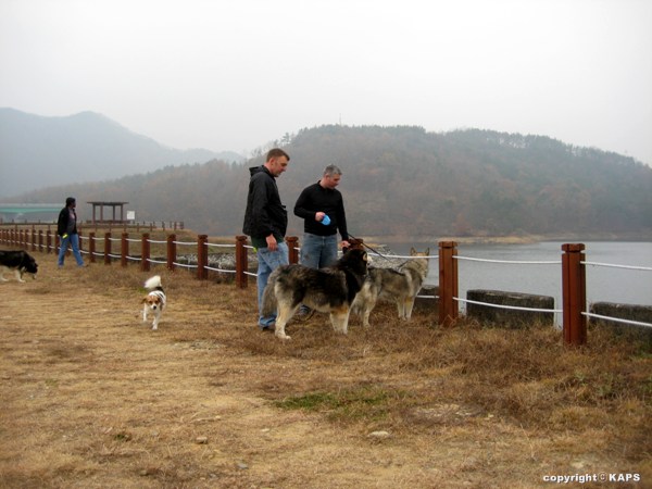 "애들아! 저 깨끗하고 아름다운 저수지 구경 좀 해라. 좋지?" 하시는 알란씨와 청동이, 호워드와 청보. 저 뒤편에는 리앤과 청실이. 저는 많이 보아와서 보통이에요.