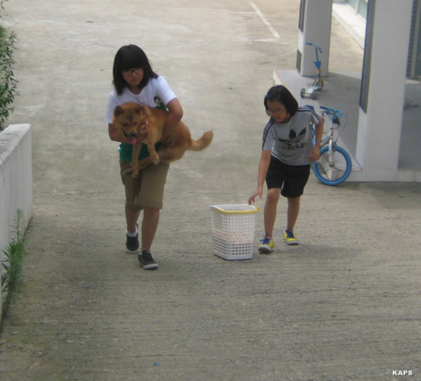 "개들이 모두 착해요." 하는 혜림이와 제성. 그렇지만 큰 개 방에는 못 들어간대요.