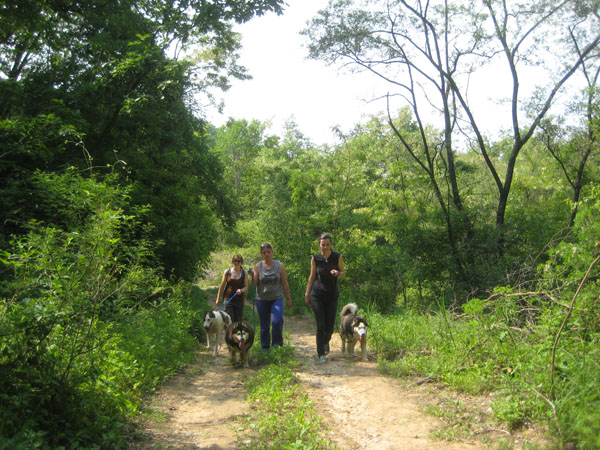 보은 보호소 곁의 숲 속에서 씩씩이(그레이 하운드) 청송(말라뮤트) 보영이(허스키)와 봉사자들