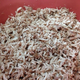 삶은 고기를 먹기 좋게 찢는 중... 밖에서는 ...