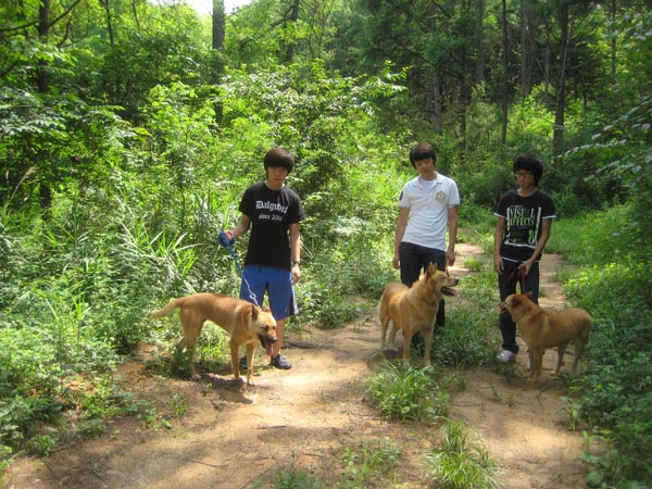 보청 저수지에 도착한 학생들과 개들.  앞에 성이와 학생.