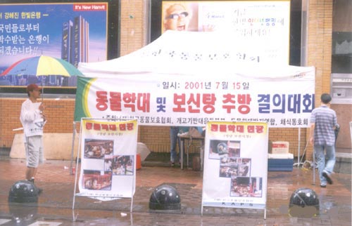 7월 15일 서울에는 비가 억수같이 쏟아졌습니다. 동물학대 및 개, 고양이 고기 반대 시위에 사람들이 나오리라고 기대하지 않았습니다. 그러나 상상 외의 많은 사람들이 참여하였습니다.. 만약 비가 오지 않았다면 정말 많은 사람들이 참가하여 우리들의 뜻을 알리는데 좋은 성과를 거두었을 텐데..... 정말 아쉽고 분통한 마음이었습니다. 비 때문에 "허씨와 "누렁이"이는 차 밖으로 나오지도 못하였습니다.