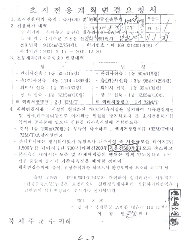 북제주군이 이광현씨의보신용 개 사육장 허가에 선흘리 마을 주민들이 항의에 이어북제주군의회에서도 반대에나서고 있어 동물사랑하는 여러분들의 개 사육장 허가취소 요구는 갈수록 희망적이 되어갑니다. 그러나 북제주군청과 이광현씨는 궁지에 몰리게 되자 뻔뻔스럽게도 북제주군은 농림부에 개를 축산물가공처리법에 넣어 달라고 신청하고 이광현씨는 개 사육장을 축소하여 주민들의 민원을 줄이는 몇 가지를 고치는 등의 계획을 변경하여 달라는 북제주군청에 "초지전용 계획변경 요청서"를 제출하였습니다.