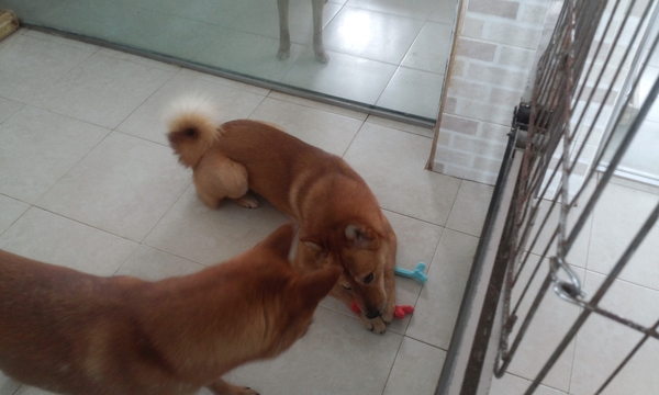 흰자와 여우도 신나게 새 장난감을 물고 맛보고(?)놀았습니다.