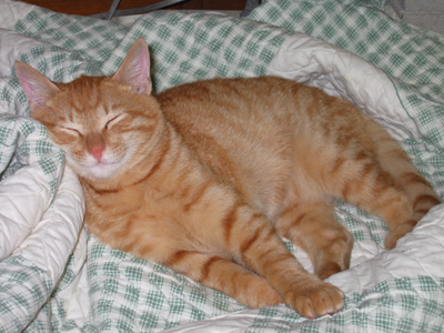 건이는 2002  10월 15일 경북 경주에서 가까운 건천 휴게소 뒷 마당 모래 위에서 묶여 살고 있는 것을 구해왔다. 그래서 이름은 "건" 이라 지어 주었다. 건이는 시골에서 자란 고양이처럼 촌 티가 나는 고양이었다. 털 색깔도 밝은 노랑색이 아닌, 마치 햇볕 따갑게 내려 쬐는 시골 들판에서 일을 많이 하여 피부가 검게 탄 농부처럼 노랑 털이 검스레 하였다. 그래도 사진을 찍으면 그리 귀여울 수가 없었다. 노는 것 또한 끝내 주게 귀엽다. 건아! 이리 와  부르며  아무리 깊이 잠 들었다가도 부시시 일어나 사람 곁으로 와서 안긴다.
