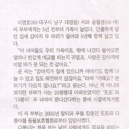 2007년 3월 10일 토요일 매일신문에 보도된 내용입니다. 협회 보호소에서 5년전 2마리의 개를 입양한 회원 윤월생씨의 입양이야기입니다.