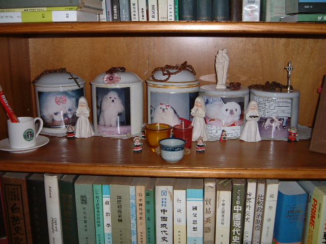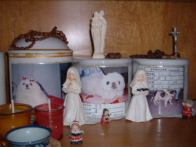 가장 오른쪽에 있는유골단지 얼룩이 무니  15살은 된  이름은 소화라는  씩씩했던 남자개 이며 , 내가 집에서 기르지는 않았지만 회사를 다니며 소하를 돌본지 10년이 넘는다.  처음 소화를 보았을때 낯선 사람을 안따르고 무척 우직하고 충성스러워 보였다.    대만시 정부애서 운영하는 주차장 인데 어느 스님이 소화를 맡기고 가셨다 한다.