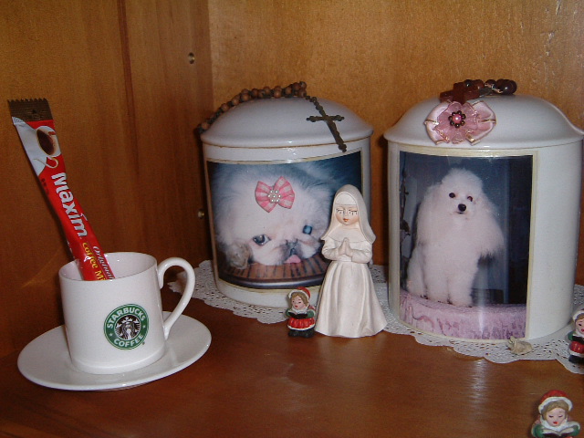 아래의 사진을 보면  먼지가 앉지 않도록 내가 아끼는 예쁜 나무 유리책장 한칸을 비워 차례로 나열하고 그 앞에는 성당서 갖고온 두가지 촛불 그리고 애들이 마실 물그릇을 놓았다. 애들이 살아생전 잘 갖고놀던 개껌도 잊지 않았다. 단지 뒤에는 습기를 없애도록 물먹는 하마도 놓았다.  우리 애들은 나를 닮아 유난히 커피를 좋아해서 스타벅스 커피잔에 커피믹스도 꽃아 두었다. 단지 중간 마다 한국 명동성당서 사온 수녀님  인형을 놓고 각단지 위에는  작은 묵주와 하느님 조각 인형도 놓아 주었다. 이제  이미 떠나 사진의 단지에 나란히 사이좋게 함께 있는 애들 이야기 부터 하려한다.