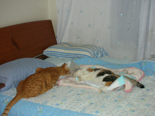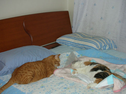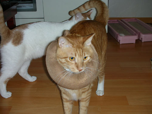 병원에서 도착. 마취에 덜 깬 "코켓". 목 칼라가 너무 커 걱정이 되긴하였죠. 곁에는 "미켓"이 걱정스레 지켜보고 있어요.