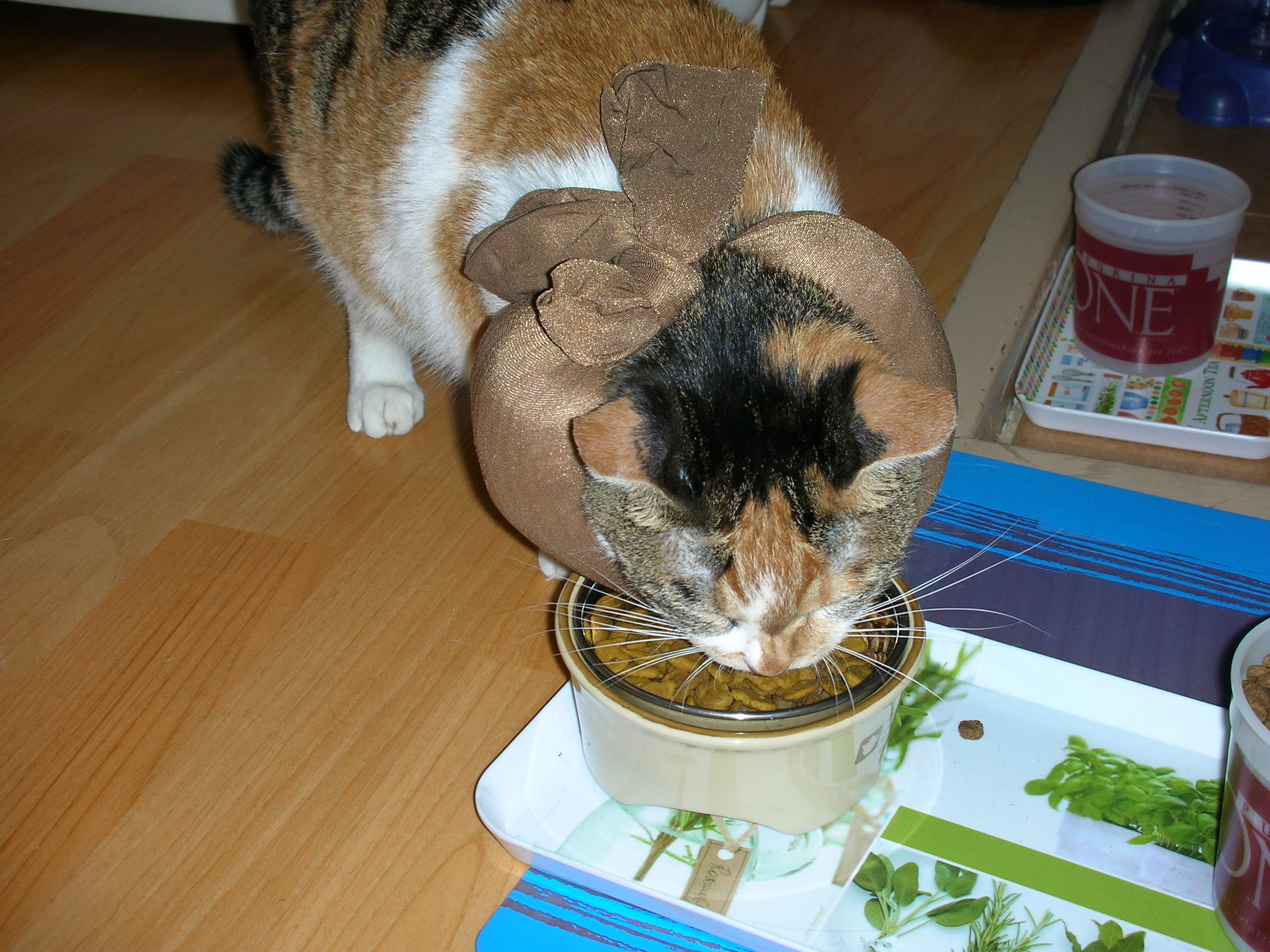 병원에서 준 칼라를 벗기고 스타킹 칼라를 만들어 둘러주니 이제 밥도 먹고 물도 먹어요.