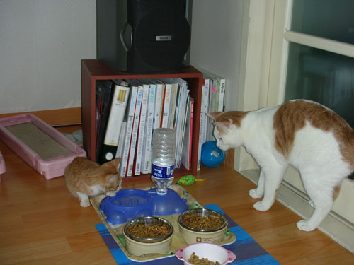 막내 "포켓"과 "쮸켓"이 맛 있는 음식 한상을 받고 뭘 생각을 하는지... 원래 고양이들은 아무리 맛 좋은 것이라 할지라도 금방 달려들어 먹지 않는 습성이 있지요. 냄새를 맡아 보고 "음~ 독을 넣지 않았군..." 하고는 먹어요. 그런 행동이 꼭 독 여부를 알아내려고 하는 것 같더라고요. 사실 그런지 안 그런지는 모르지만...