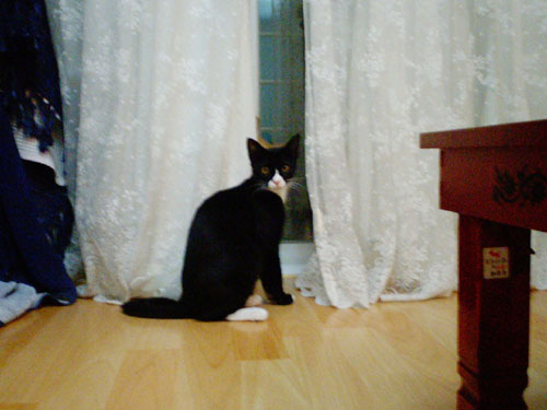 미켓이 코켓을 보자 눈을 왕방울 만하게 뜨더니 하악 " 하는거 있죠. 밤색 스타킹이라 지딴엔 코켓누나가 털세운줄 알고 놀랐나? 하하 ..