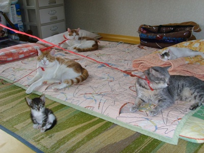 고양이들이 묶여있는 것이 보기가 안타깝네요- 묶어 놓지 않고 지낼 수 있는 방법을 생각해봤으면 좋겠어요.