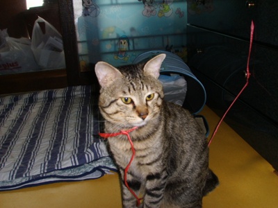 아~그거요? 집이 좁아 냥이들이 한꺼번에 돌아 다니면 제가 통제가 안돼요.(지금7마리 거든요)그런데다 요즘 날이 더워 현관 문을 열어 놓으면@#$말 안해도 아시겠지요?이웃집에서 냥이 키운다고 뭐라는 안하지만 쫌 신경이 쓰이네요.그래서 어쩔 수 없이 큰 냥이들은 노끈(그것도 빨간 노끈)으로 묶아 놓았어요. 냥이들 한테는 미안하지만^^